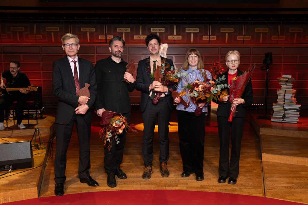 Årets pristagare. I mitten står Oskar Kroon och Hanna Klinthage. Längst till höger står Emilia Piotrowska. Foto: Andreas Sundbom/Augustpriset