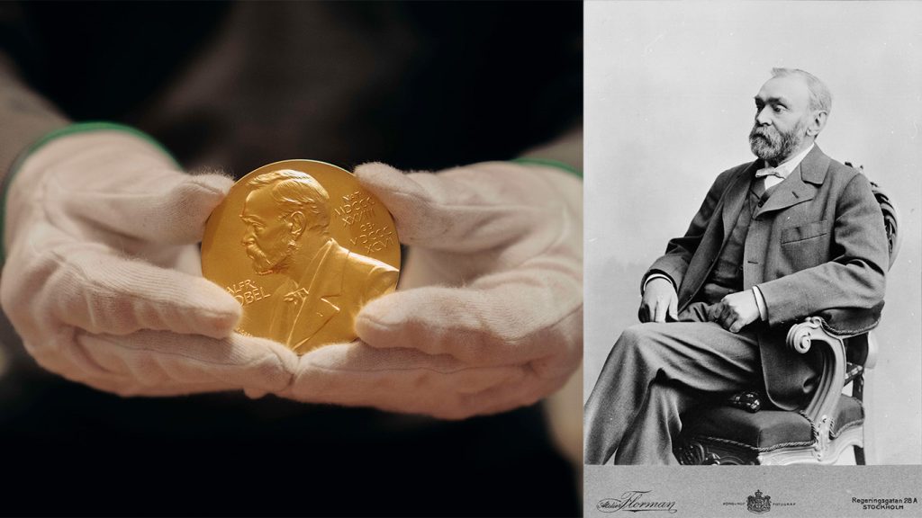 Vänstra bilden: Nobelpriset. Foto: ©Nobel Prize Outreach/Clément Morin Högra bilden: Alfred Nobel. Foto: Flormans alteljé/Tekniska museet