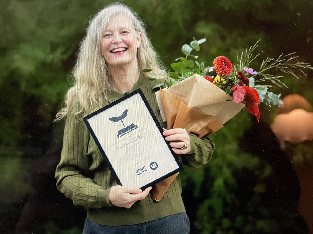 Cecilia Lidbeck tog emot Barnradions bokpris 2025 för sin bok "En odödlig vänskap". Foto: Sveriges radio