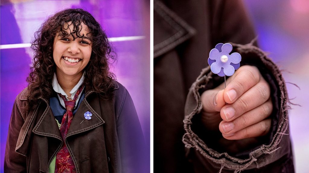 Årets majblomma är viol-färgad och saknar ett blad. Det är 16-åriga Alexis Monnakgotla Svensson som har skapat den.